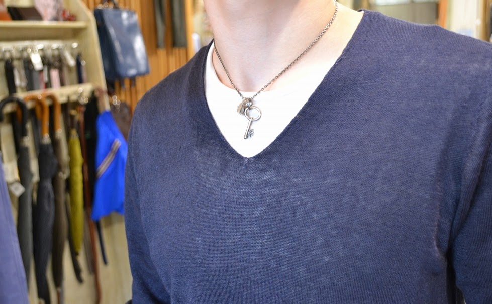 あえて丸首のインナーを合わせ、